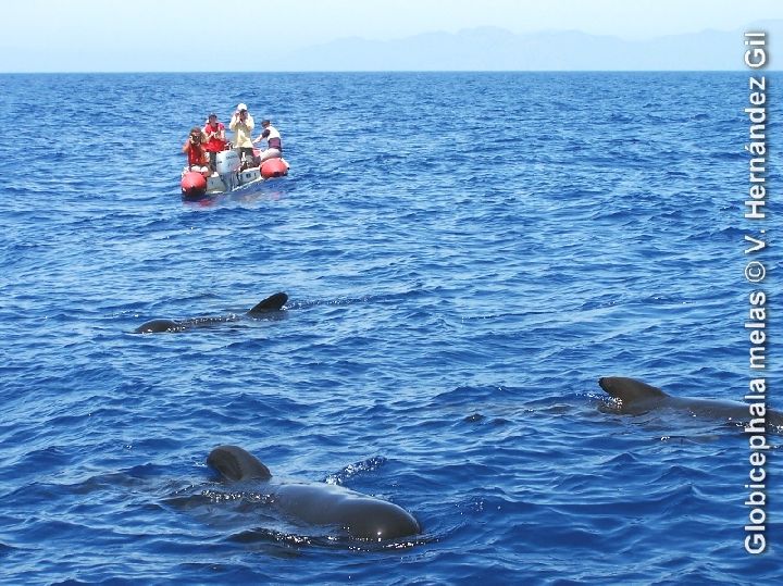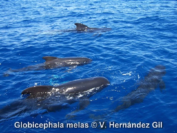 En cuanto al tamaño, los Calderones son grandes, oscilando entre los 3 y los más de 6 m. de longitud de los machos, más grandes que las hembras, y llegando a pesar más de 3 toneladas, lo que da una idea aproximada de la corpulencia de estos delfines. Además del tamaño, la forma de la aleta dorsal es un rasgo distintivo, tanto de la especie como de los individuos, de su edad, y del sexo del animal, siendo la fotografía de éstas un dato importante en su identificación. En las hembras es más recta, y menos bulbosa, que la muy arqueada de los machos. También son de gran ayuda las cicatrices y señales que presentan en su piel.